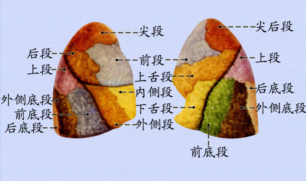 肺段:肺段支气管及其分支分布的肺组织称一个肺段,肺段是肺手术的切除单位。★