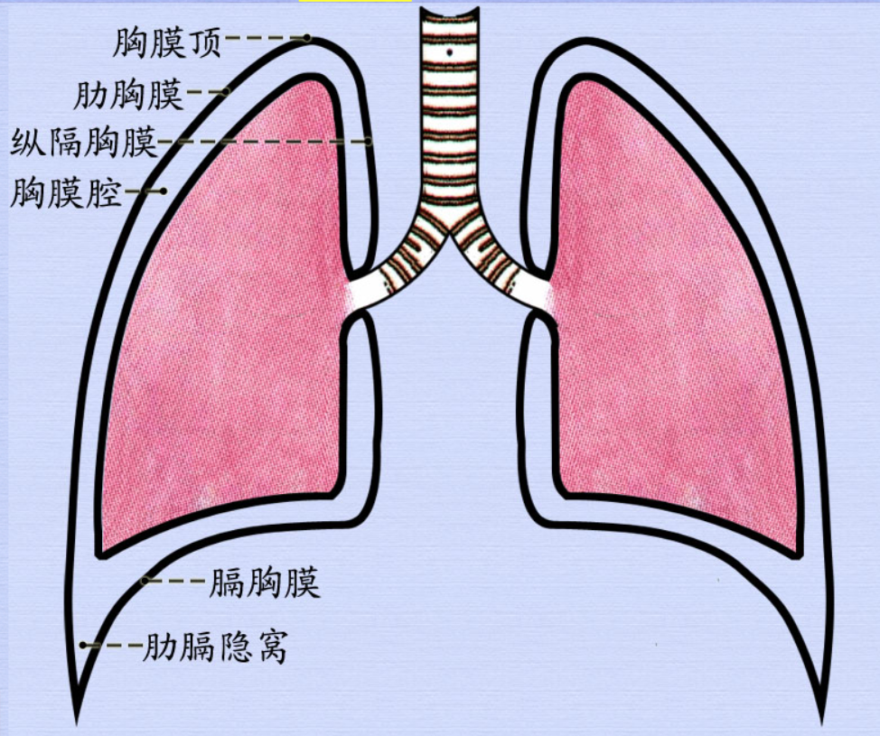 脏胸膜和壁胸膜在肺根处互相延续,形成密闭的腔隙称胸膜腔。胸膜腔左、右各一,互不相通,腔内呈负压,有少量浆液,可减少呼吸时两层胸膜间的摩擦力。★★