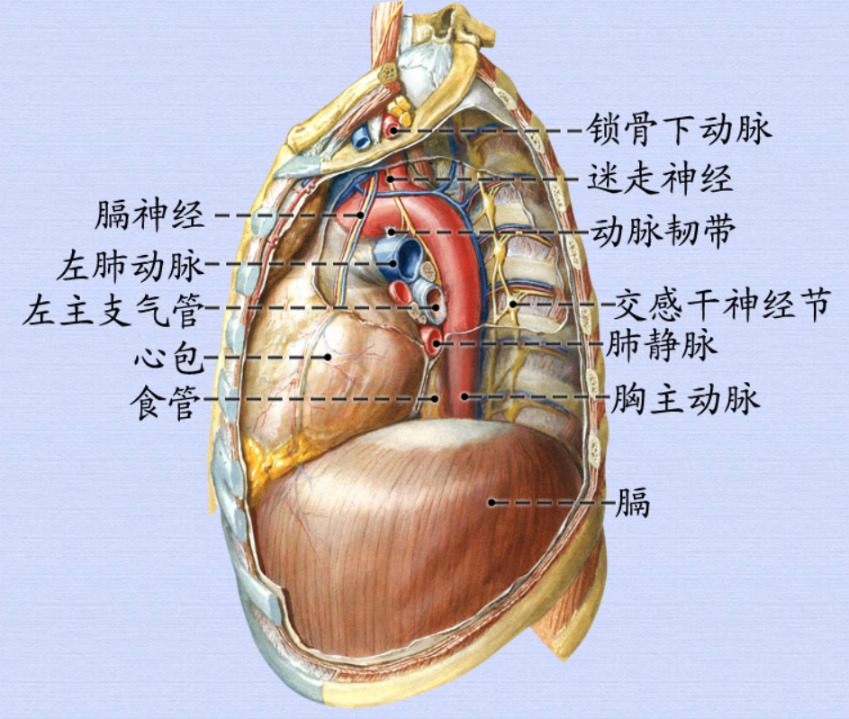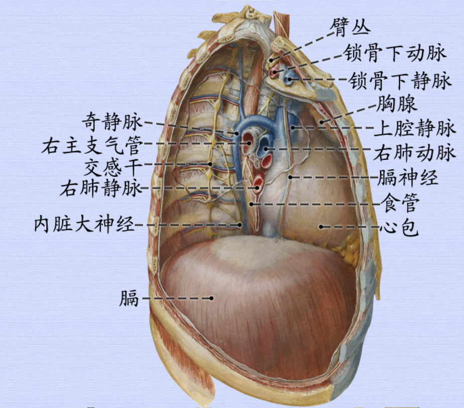 上纵隔内主要有胸腺、气管、食管和膈神经;中纵隔内主要有心包、心和大血管;后纵隔内主要有主支气管、食管、胸主动脉、奇静脉、胸导管、迷走神经和胸交感干等。