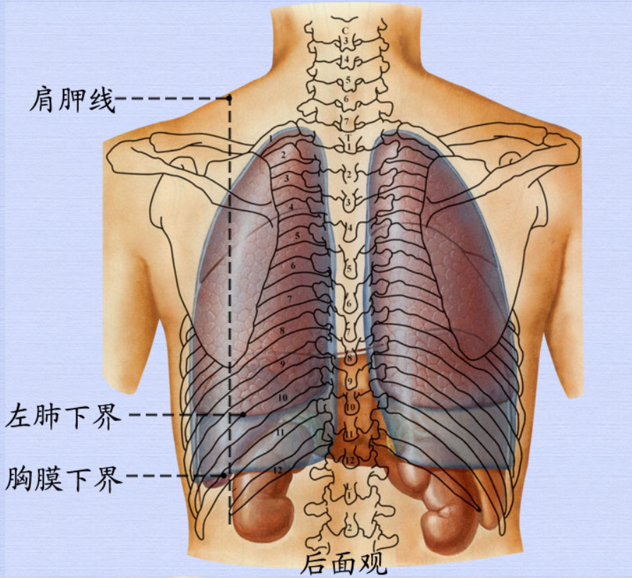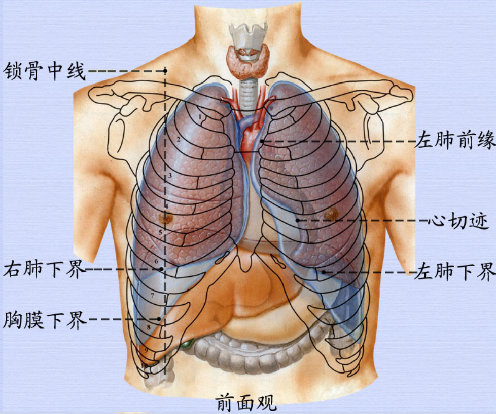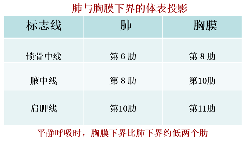 胸膜顶和肺尖一致,体表投影均位于锁骨内侧1/3部上方2~3cm处。平静呼吸时,胸膜下界较肺下界的体表投影大致低2肋。