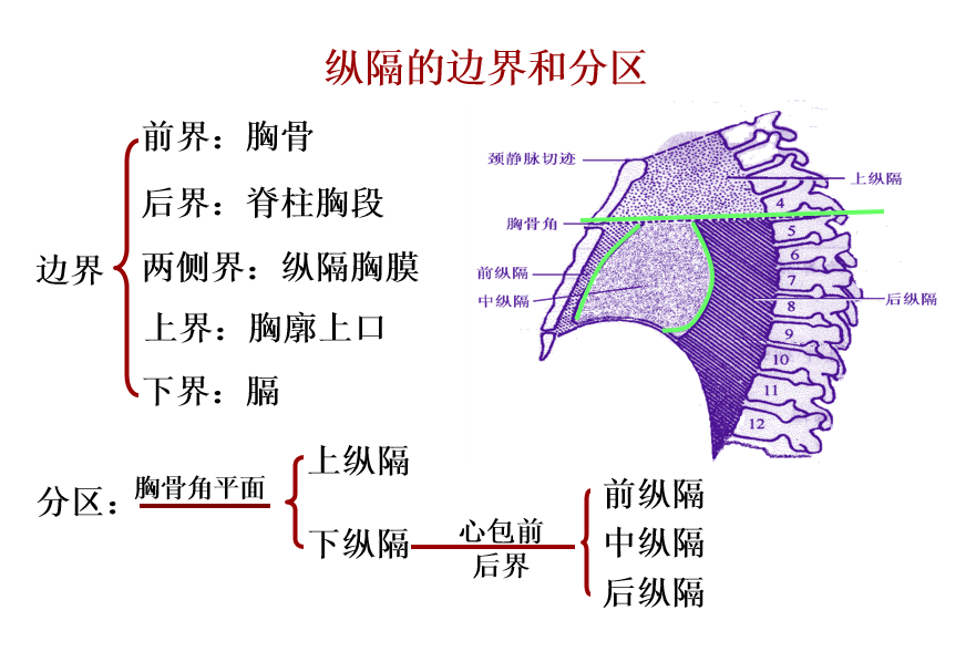 纵隔是两侧纵隔胸膜之间的全部器官、结构及结缔组织的总称。以胸骨角平面将纵隔分上纵隔和下纵隔。下纵隔又以心包为界分为3部分:胸骨与心包之间为前纵隔;心包与脊柱之间为后纵隔;心及大血管所在部位称中纵隔。★★