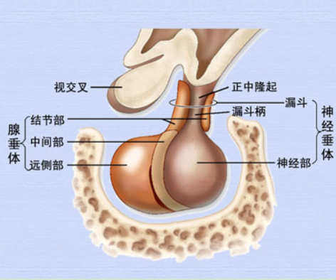 垂体又称脑垂体,位于颅中窝蝶骨的垂体窝内,上端借漏斗与下丘脑相连,分为腺垂体和神经垂体两部分。