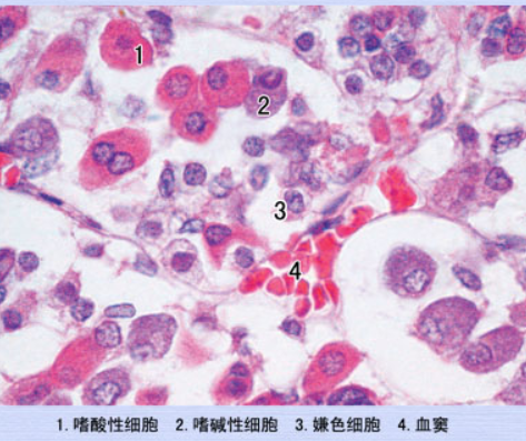 腺垂体细胞分三种:嗜酸性细胞分泌生长素;嗜碱性细胞分泌促甲状腺素、促肾上腺皮质激素和促性腺激素;嫌色细胞功能不详。★★