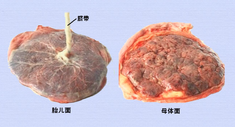 母体面:粗糙,含胎盘小叶,绒毛干,绒毛间隙充满母体血液。