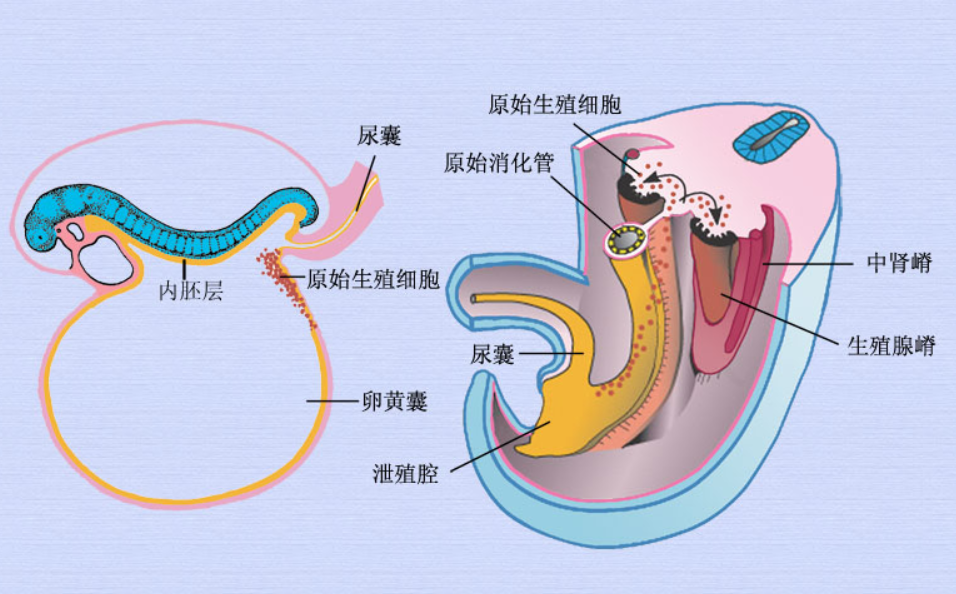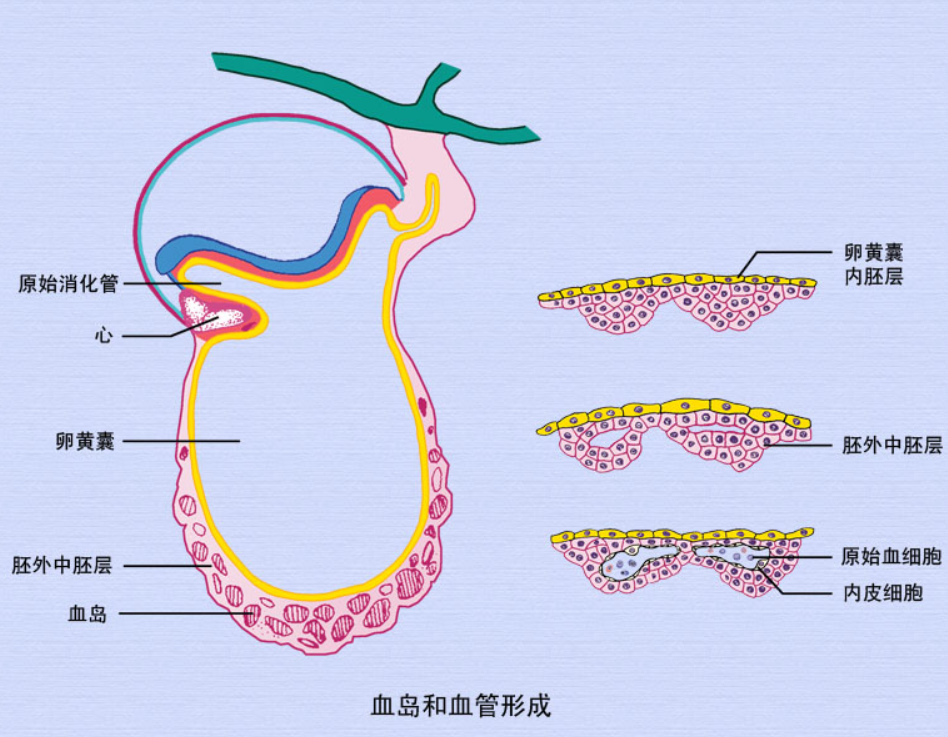 ②卵黄囊:部分内胚层分化成为原始生殖细胞,胚外中胚层是造血干细胞的发源地。
