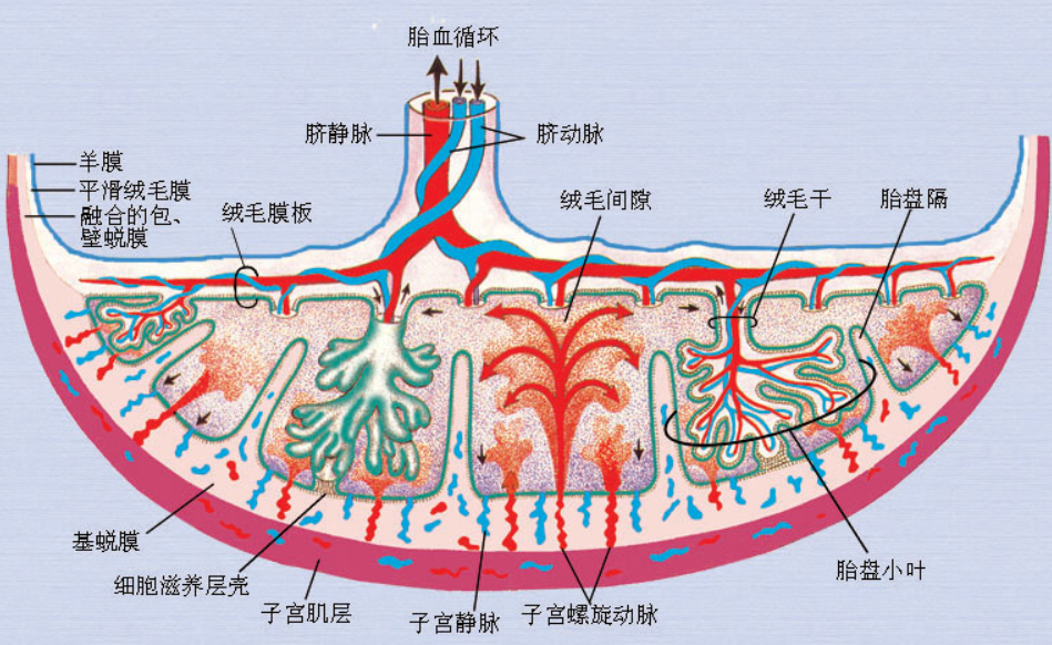 1)物质交换-胎儿通过胎盘从母血中获得营养和O2,排出代谢产物和CO2。