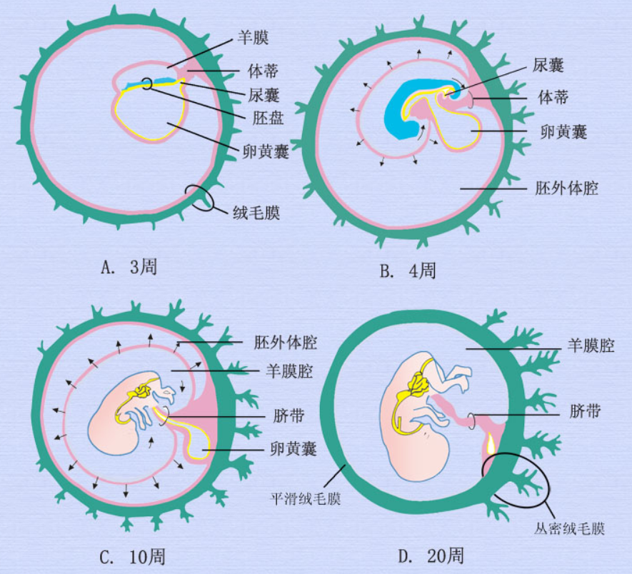 绒毛膜由滋养层和衬于其内面的胚外中胚层组成。按照发育先后的不同分为初级绒毛干、次级绒毛干和三级绒毛干。胚胎早期,绒毛均匀分布于绒毛膜表面。后由于包蜕膜血液供应匮乏,该部位绒毛退化、消失,形成平滑绒毛膜。基蜕膜血供充足,该处绒毛生长茂密,称丛密绒毛膜。★★