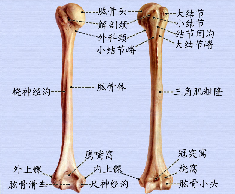 3.肱骨:位于臂部,属长骨,分为一体两端。有肱骨头、大结节、小结节、外科颈、三角肌粗隆、桡神经沟、肱骨小头、肱骨滑车、鹰嘴窝和尺神经沟等结构。