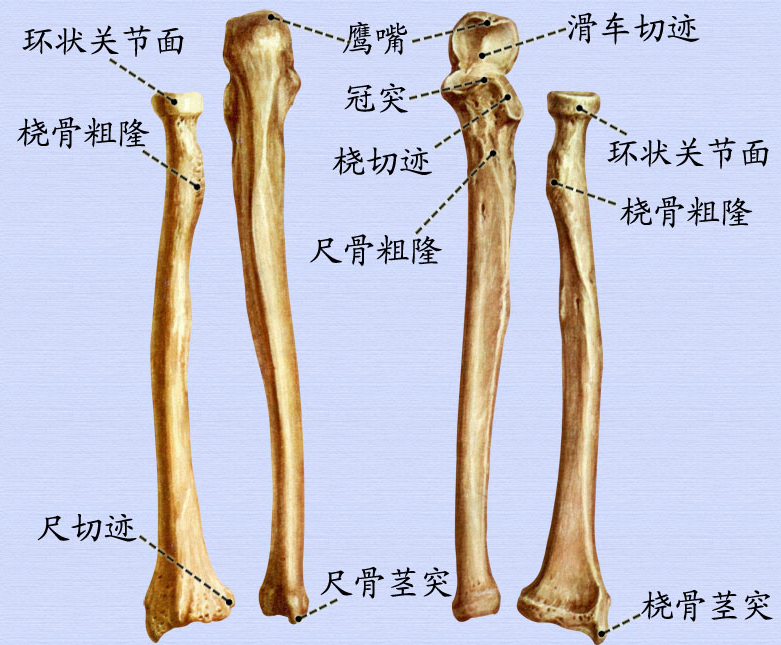 4.尺骨:位于前臂内侧,有滑车切迹、鹰嘴、冠突、桡切迹、尺骨头和尺骨茎突等结构。