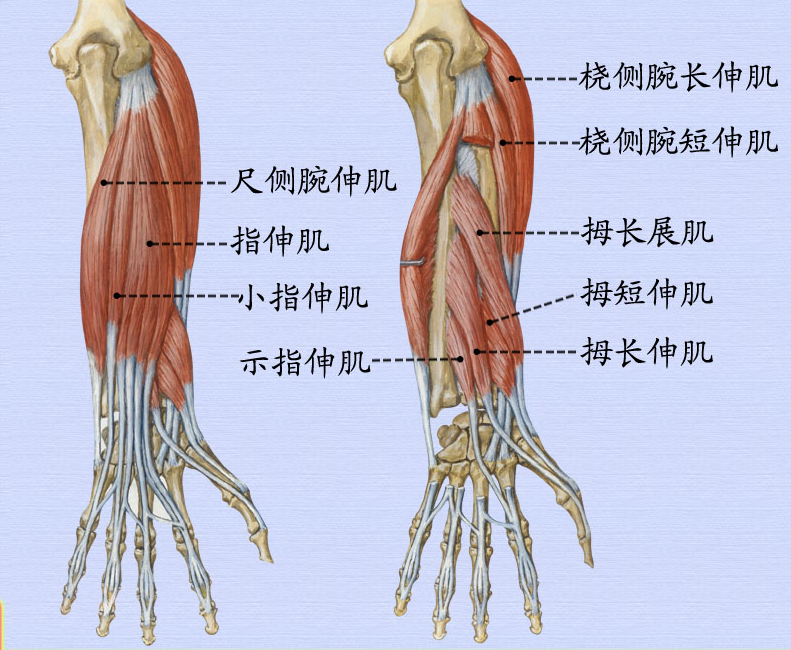 3.前臂肌:位于尺、桡骨周围,分为前群和后群。前群共9块,可屈桡腕关节、掌指关节、指骨间关节和使前臂旋前。后群共10块,能伸桡腕关节、掌指关节、指骨间关节和使前臂旋后。