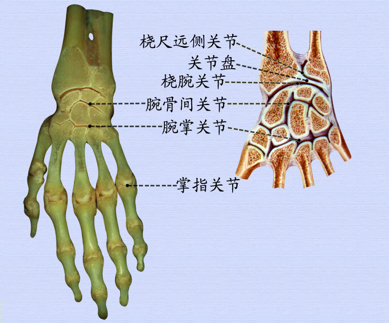 4.手关节:包括桡腕关节又称腕关节、腕骨间关节、腕掌关节、掌骨间关节、掌指关节和指骨间关节。