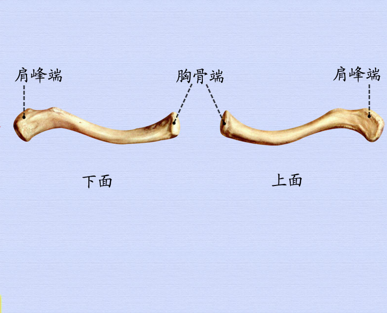 1.锁骨:又称美人骨,位于皮下,全长可在体表摸到。内侧端粗大称胸骨端,外侧端扁平称肩峰端。锁骨骨折多发生于中、外1/3交界处。