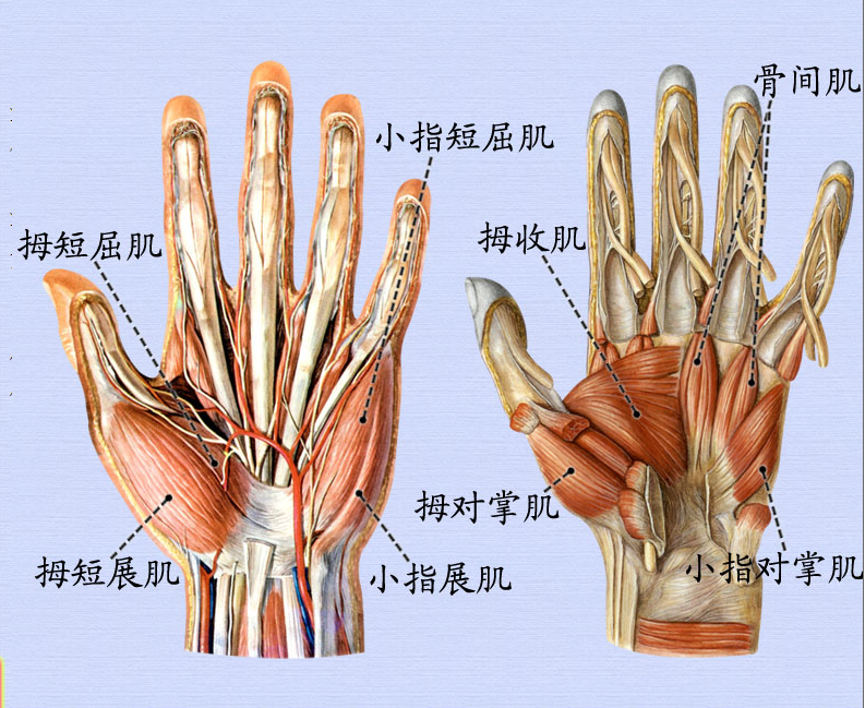 4.手肌:位于手掌,为运动手指的短肌,分为3群:外侧群较发达,在手掌形成隆起,称鱼际,可使拇指屈、外展、内收和对掌;内侧群较小,在手掌形成小鱼际,可使小指屈、外展;中间群包括蚓状肌和骨间肌,运动2、3、4指。