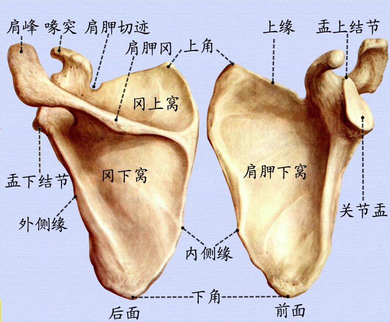 2.肩胛骨:为三角形扁骨,有关节盂、肩胛冈、冈上窝、冈下窝、肩峰、上角、下角和外侧角等结构,双手自然下垂时,肩胛骨上角平对第2肋,肩胛骨下角平对第7肋。