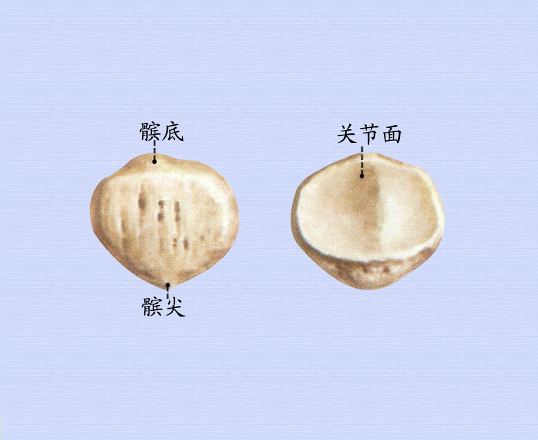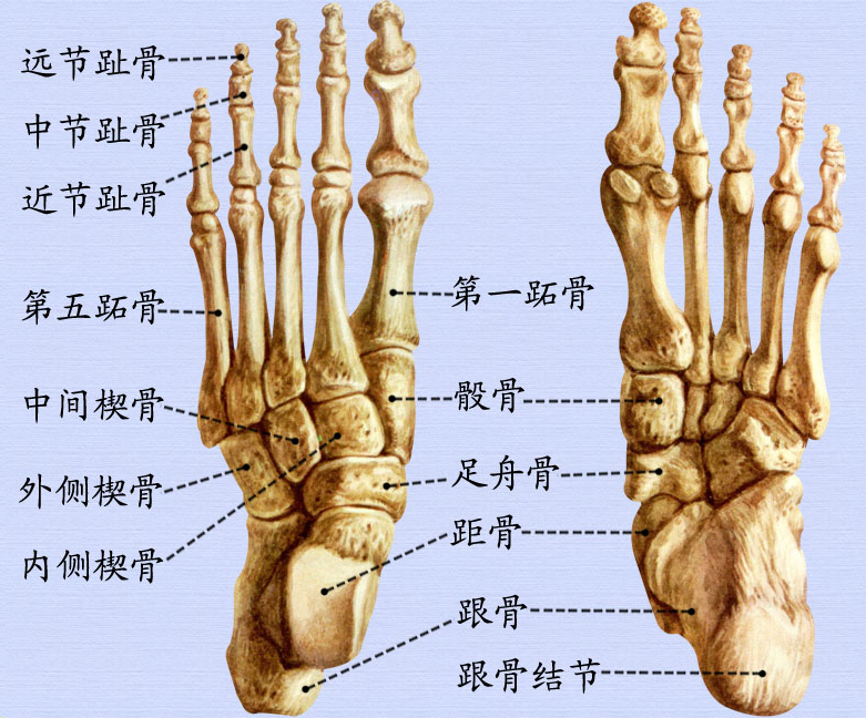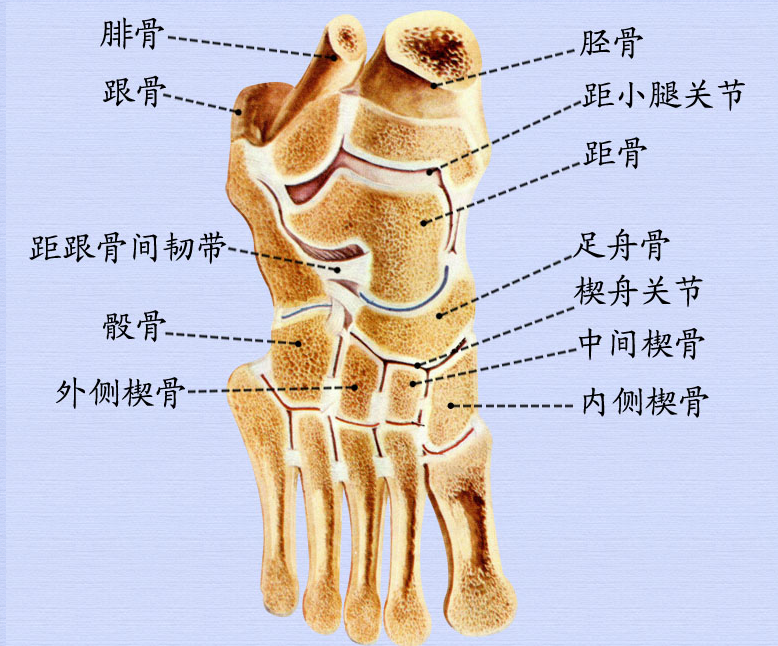(1)跗骨:每侧7块,分为后、中、前3列,后列为跟骨和距骨,中列为足舟骨,前列由内向外依次为内侧楔骨、中间楔骨、外侧楔骨和骰骨。