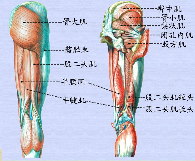 (2)后群:位于股后部,共有3块,有股二头肌、半腱肌和半膜肌,作用:屈膝关节和伸髋关节。