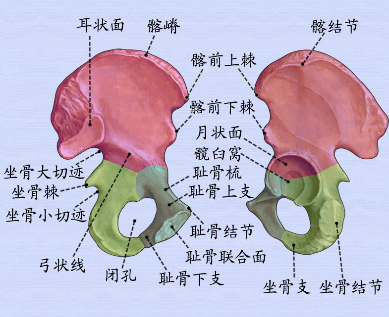 (3)耻骨:位于髋骨的前下部,分为耻骨体、耻骨上支和耻骨下支3部分。有耻骨结节、耻骨上支、耻骨下支、耻骨联合面等结构。