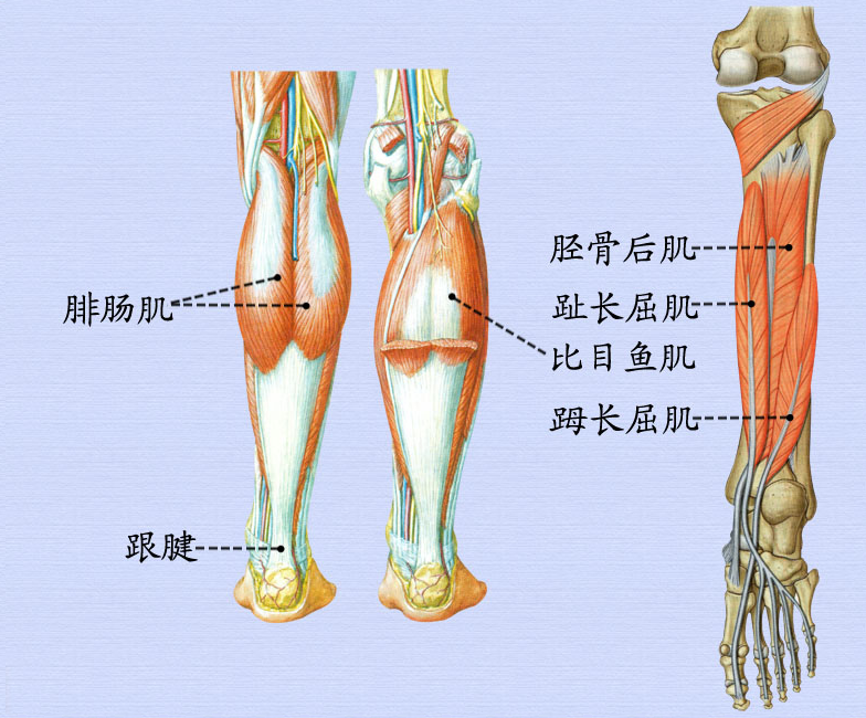 (3)后群:分浅层和深层,浅层包括腓肠肌和比目鱼肌,合称小腿三头肌,作用:提足根、使跖屈;深层有胫骨后肌、踇长屈肌和趾长屈肌,作用:使足内翻、跖屈和屈趾。