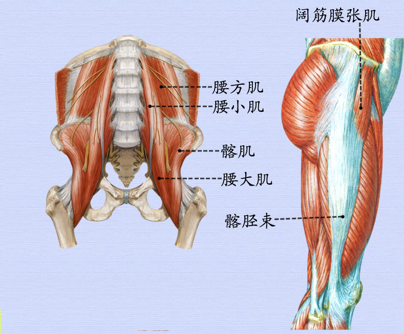 (1)前群:主要有髂腰肌,髂腰肌由腰大肌和髂肌组成,作用:使髋关节前屈和旋外。