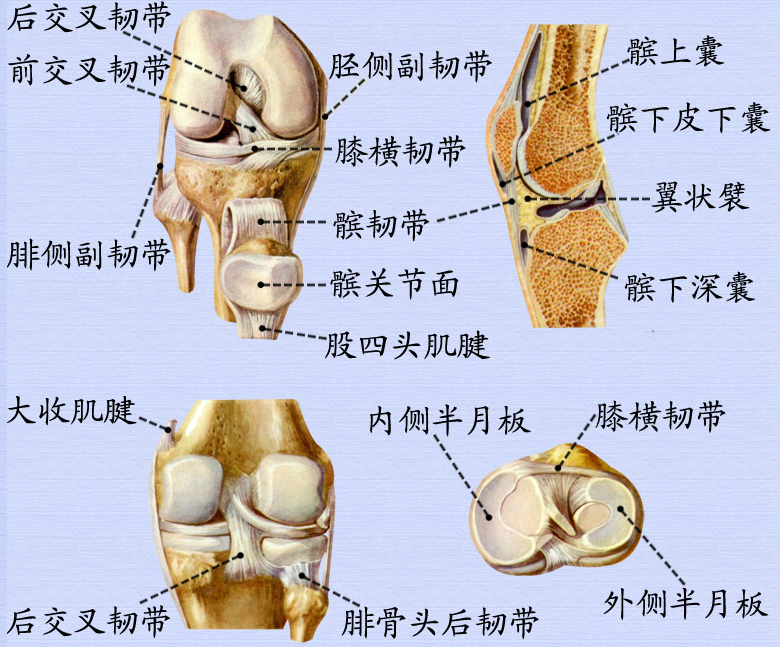 3.膝关节:由股骨下端、胫骨上端和髌骨构成,是人体最大、最复杂的关节,辅助加强结构有:髌韧带、腓侧副韧带、胫侧副韧带、前交叉韧带、后交叉韧带、内“C”外“O”形的半月板。★