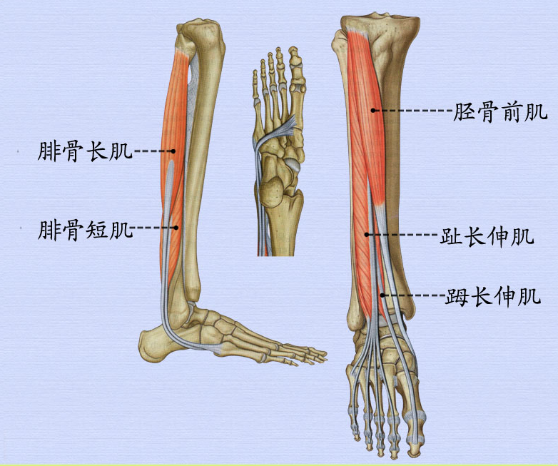 (1)前群:包括胫骨前肌、踇长伸肌和趾长伸肌,作用:使踝关节背屈和伸,使足内翻、伸趾等。