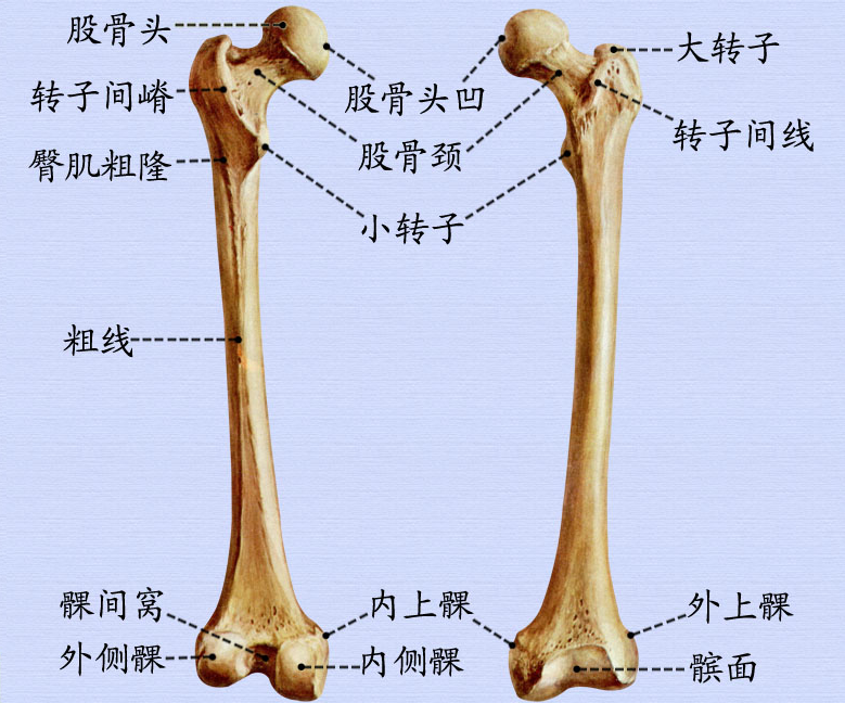 2.股骨:全身最长的长骨,有股骨头、股骨颈、大转子、小转子、臀肌粗隆、内上髁、外上髁、内侧髁和外侧髁等结构。