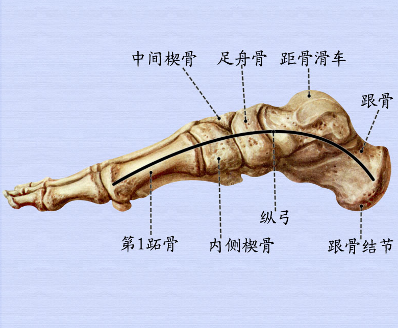 5.足弓:由跗骨与跖骨借韧带、肌和肌腱紧密相连,在纵、横方向上形成凸向上的弓形结构称足弓。足弓有利于行走和跳跃,并能缓冲震荡;保护足底血管、神经免受压迫。如果足底韧带、肌和肌腱过度劳损、先天发育不良或骨折损伤等,可导致足弓塌陷,形成扁平足。★★