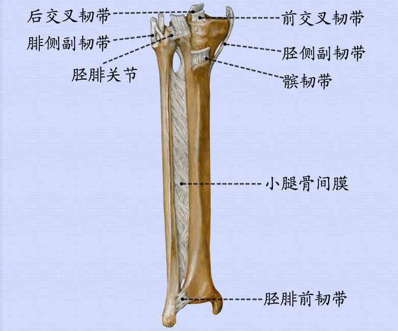4.胫骨:位于小腿内侧,呈三棱柱状的粗大长骨,有内侧髁、外侧髁、胫骨粗隆、胫骨前缘和内踝等结构。