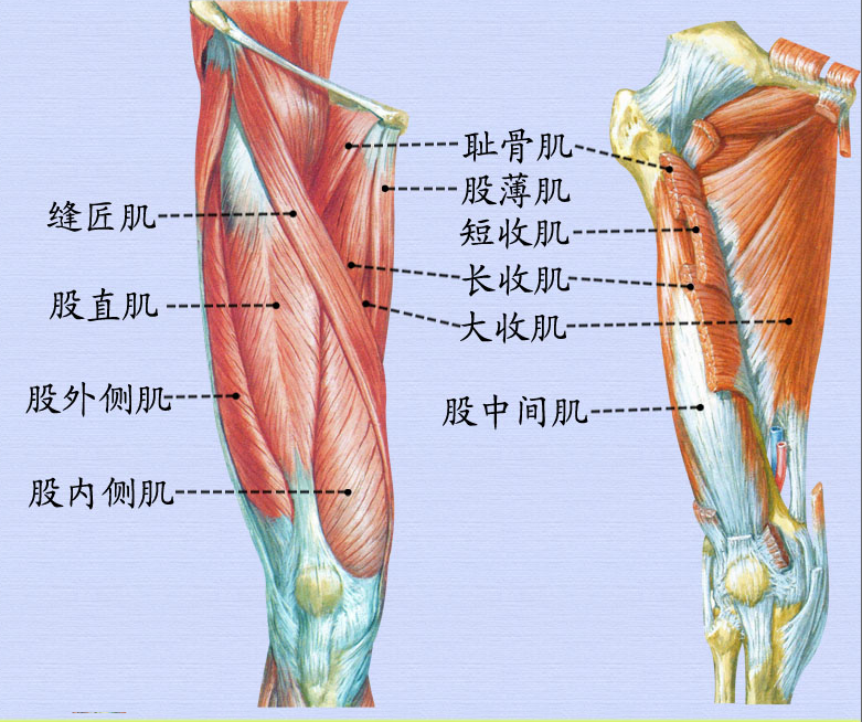 (3)内侧群:位于大腿内侧,主要有耻骨肌、长收肌、短收肌、股薄肌等,主要作用:使大腿内收和旋外。