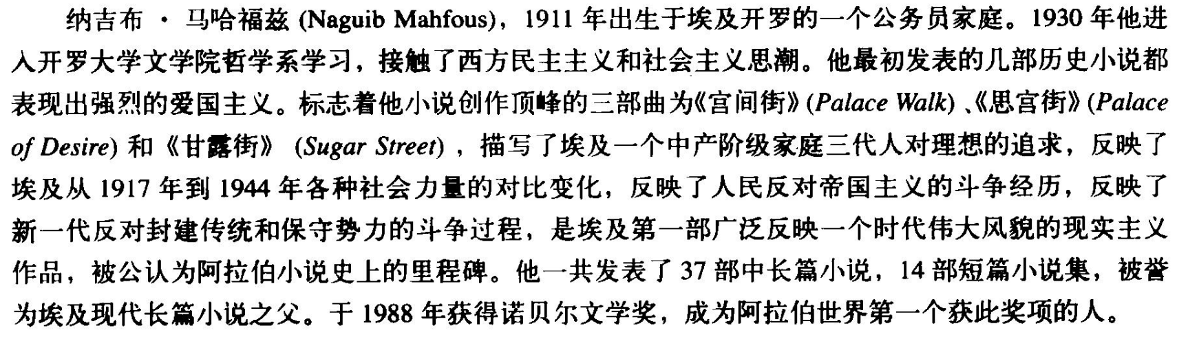 Naguib Mahfouz was the first Arab to win the Nobel prize for literature, in 1988. He has been described as “a Dickens(迪更斯1812-1870, 英国著名现实主义小说家)of the Cairo cafés” and “the Balzac(巴尔扎克1799-1850, 法国小说家) of Egypt".