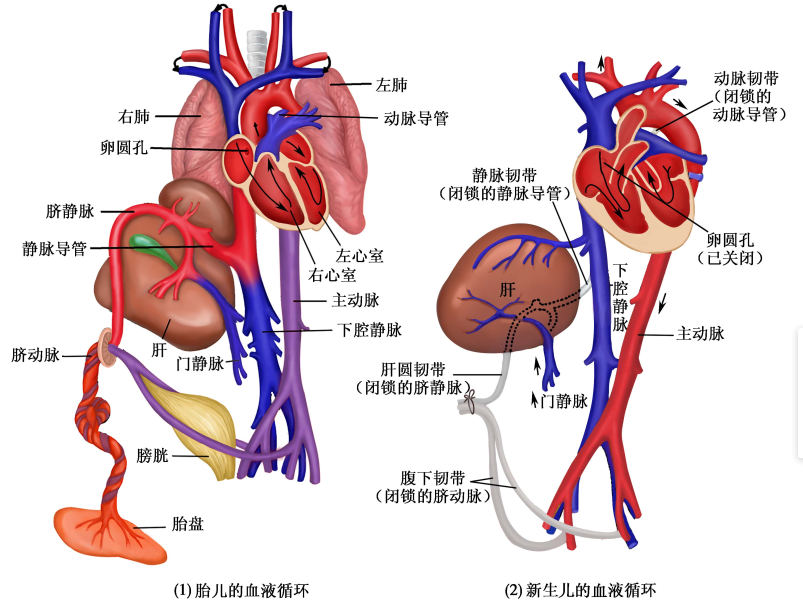 胎儿的营养供给和代谢产物排出,均需经胎盘转输后由母体完成。由于胎儿期肺循环阻力高及胎盘脐带循环的存在,胎儿期的心血管循环系统不同于新生儿的心血管循环系统。