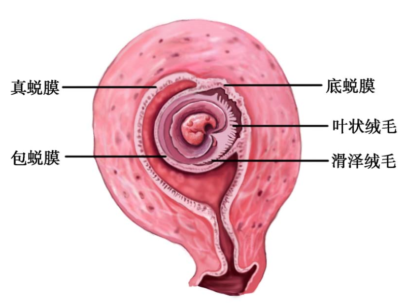 图4-4 早期妊娠子宫蜕膜与绒毛的关系