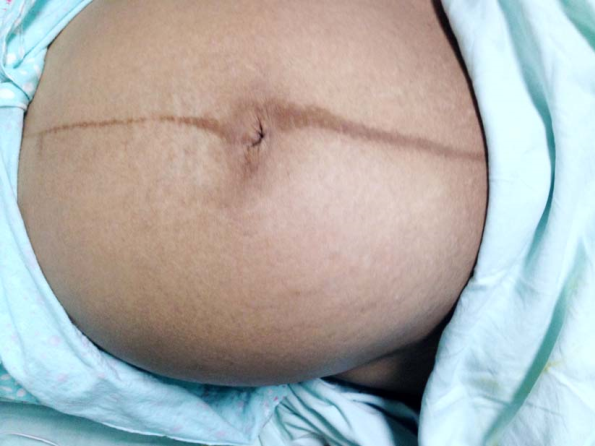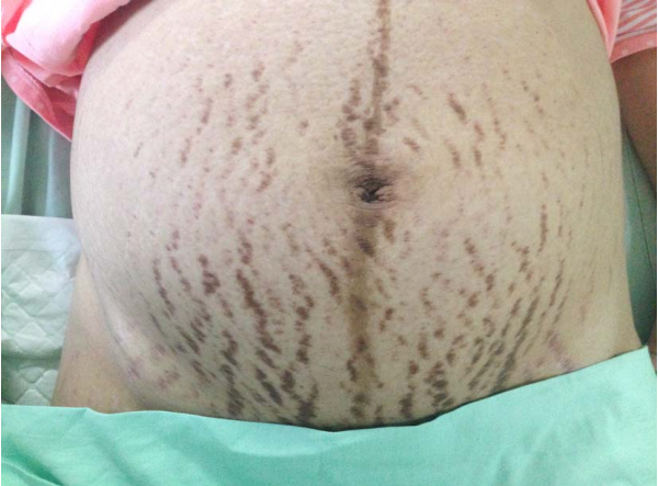 妊娠期促黑素细胞刺激激素(MSH)的分泌增多,加之大量的雌、孕激素有黑色素细胞刺激效应,使黑色素增加,导致孕妇乳头、乳晕、腹白线、外阴等处出现色素沉着。色素沉着于颧颊部并累及眶周、前额、上唇和鼻部,边缘较明显,呈蝶状褐色斑,称为妊娠黄褐斑(chloasma gravidarum),于产后自行消退。妊娠期间肾上腺皮质分泌的糖皮质激素增多,该激素分解弹力纤维蛋白,使弹力纤维变性,加之子宫的增大使孕妇腹壁皮肤张力加大,皮肤的弹力纤维断裂,呈多量紫色或淡红色不规律平行略凹陷的条纹,称为妊娠纹(striae gravidarum),见于初产妇。旧妊娠纹呈银色光亮,见于经产妇。