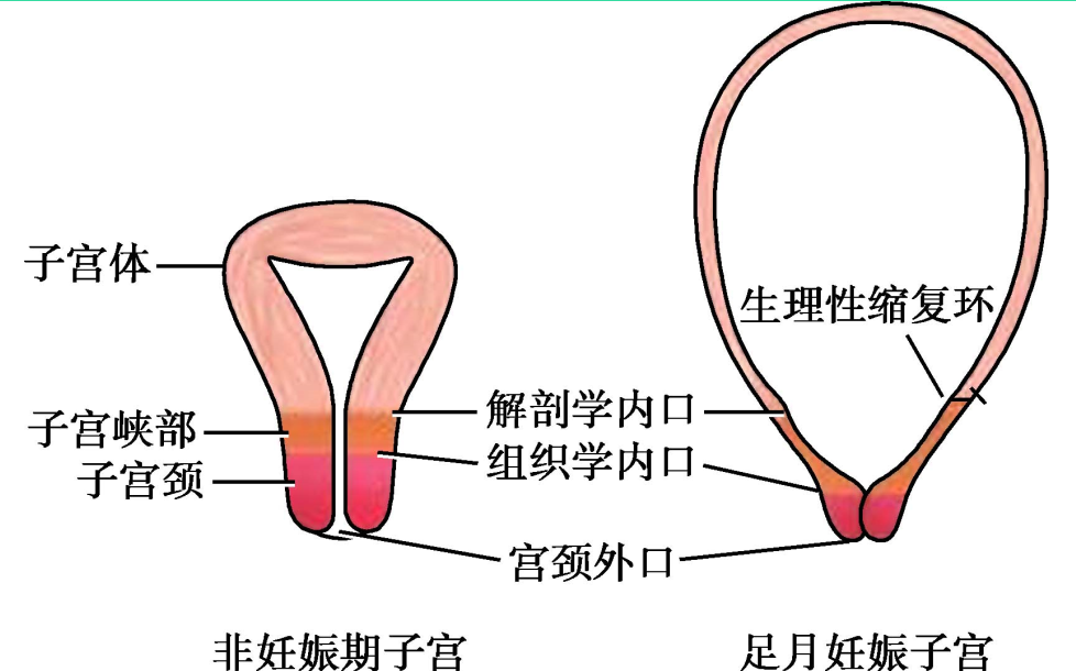 4.子宫峡部  位于宫体与宫颈之间最狭窄的组织结构。非孕时长约1cm,妊娠后子宫峡部变软,逐渐伸展拉长变薄,扩展成宫腔一部分,临产后伸展至7~10cm,成为产道一部分,称为子宫下段,是产科手术学的重要解剖结构。