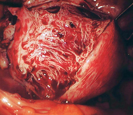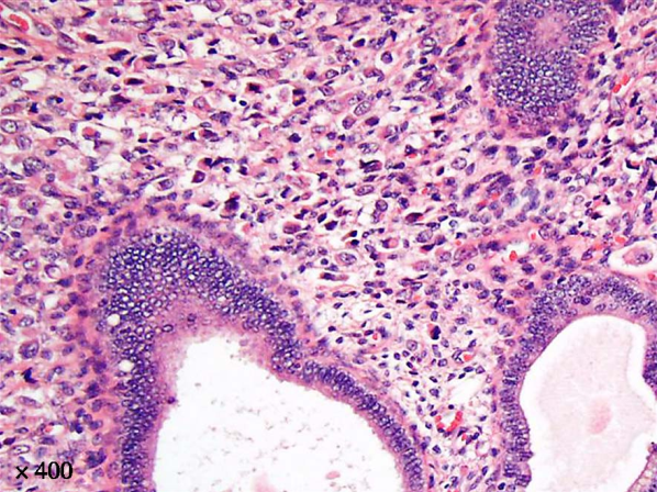 异位内膜在子宫肌层多呈弥漫性生长,累及后壁居多,故子宫呈均匀性增大,前后径增大明显,呈球形,一般不超过12周妊娠子宫大小。剖面见子宫肌壁显著增厚且硬,无旋涡状结构,于肌壁中见粗厚肌纤维带和微囊腔,腔内偶有陈旧血液。少数腺肌病病灶呈局限性生长形成结节或团块,似肌壁间肌瘤,称为子宫腺肌瘤(adenomyoma),因局部反复出血导致病灶周围纤维组织增生所致,故与周围肌层无明显界限,手术时难以剥出。镜检特征为肌层内有呈岛状分布的异位内膜腺体及间质,特征性的小岛由典型的子宫内膜腺体与间质组成,且为不成熟的内膜,属基底层内膜,对雌激素有反应性改变,但对孕激素无反应或不敏感,故异位腺体常呈增生期改变,偶尔见到局部区域有分泌期改变。