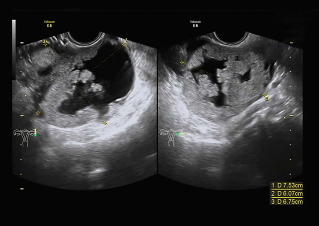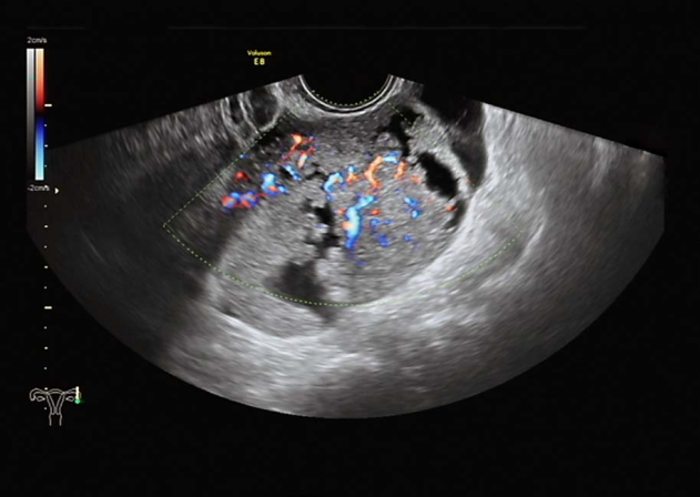 子宫水平位,如孕50天大小,内膜厚0.3cm,宫区内见多个低回声区,右卵巢3.0×2.7×2.4cm,部分囊性,内液清。左附件区见7.5×6.1×6.8cm囊实性包块,实性为主,边界尚清,周边可见部分卵巢组织,实性部分回声偏强,血流较丰富,能量多普勒提示实性部分血流丰富,RI=0.3。