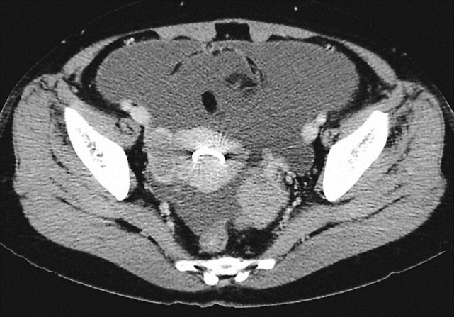盆腔内子宫两侧见不规划软组织肿块影,增强扫描病灶轻中度强化改变,盆腔、腹腔内见积液,宫腔内见环影