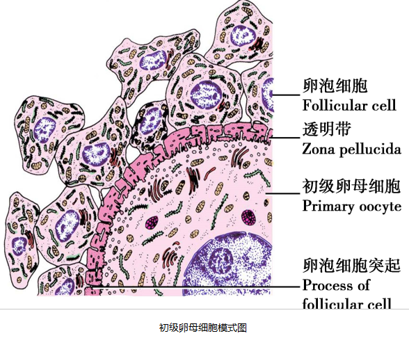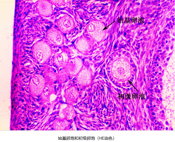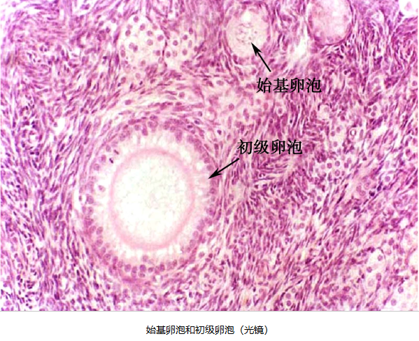 (1)始基卵泡:由停留于减数分裂双线期的初级卵母细胞被单层梭形前颗粒细胞围绕而形成。