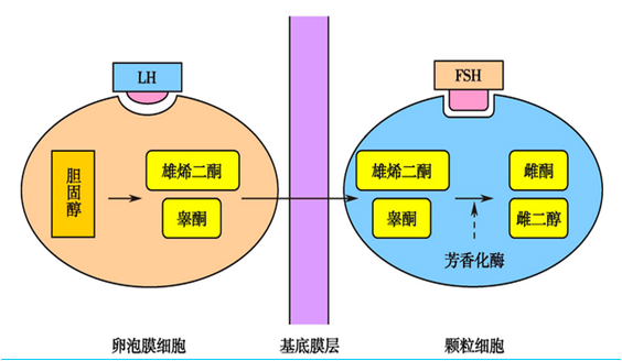 图3-5  雌激素合成的两细胞-两促性腺激素学说示意图