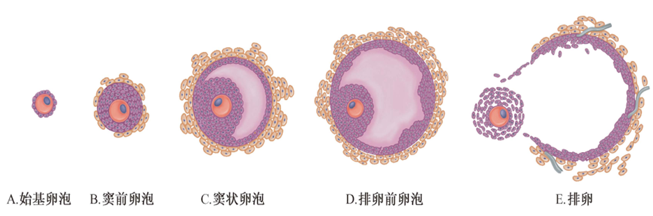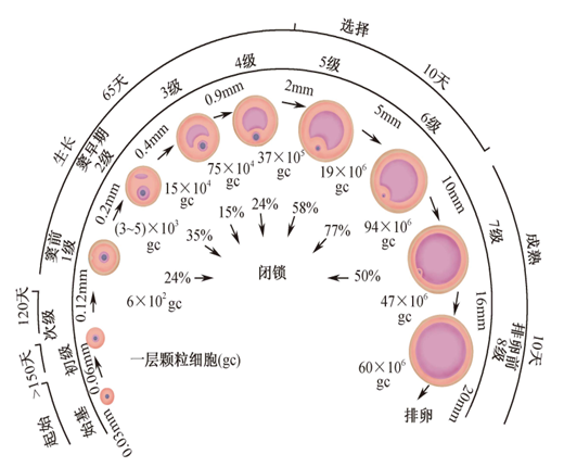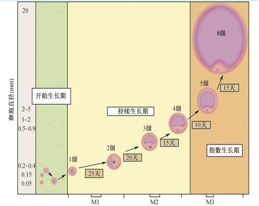 根据卵泡的形态、大小、生长速度和组织学特征,可将其生长过程分为以下几个阶段(图3-3)。