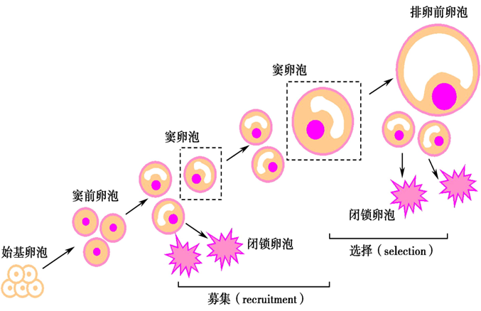 1.卵泡发育和成熟  进入青春期后,卵泡由自主发育推进至发育成熟的过程依赖于促性腺激素的刺激。生育期每月发育一批(3~11个)卵泡,经过募集、选择,其中一般只有一个优势卵泡可达完全成熟,并排出卵子。其余的卵泡发育到一定程度通过细胞凋亡机制而自行退化,称卵泡闭锁。女性一生中一般只有400~500个卵泡发育成熟并排卵,仅占总数的0.1%左右。