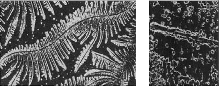 左图:羊齿植物叶状结晶;右图:排列成行的椭圆体