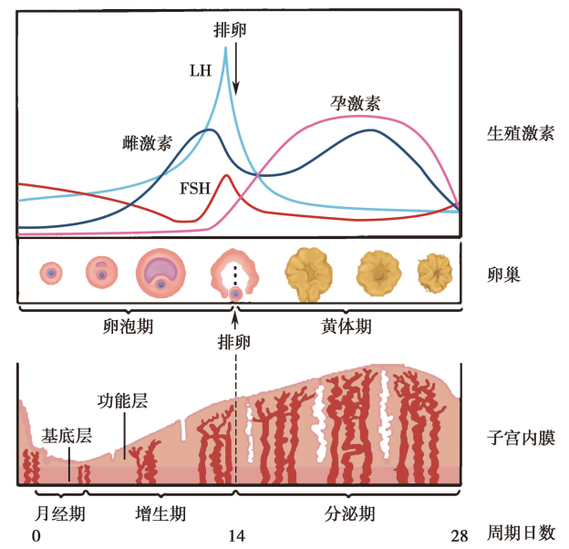 FSH是卵泡发育必需的激素,其主要生理作用包括:①直接促进窦前卵泡及窦卵泡颗粒细胞增殖与分化,分泌卵泡液,使卵泡生长发育;②激活颗粒细胞芳香化酶,合成与分泌雌二醇;③在前一周期的黄体晚期及卵泡早期,促使卵巢内窦卵泡群的募集;④促使颗粒细胞合成分泌IGF及其受体、抑制素、激活素等物质,并与这些物质协同作用,调节优势卵泡的选择与非优势卵泡的闭锁退化;⑤在卵泡期晚期与雌激素协同,诱导颗粒细胞生成LH受体,为排卵及黄素化作准备。