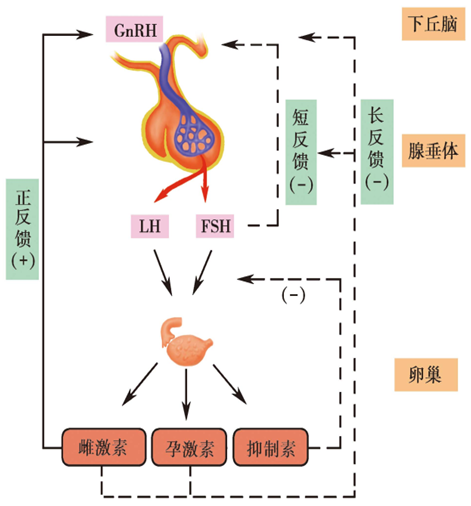 下丘脑是HPO的启动中心,GnRH的分泌受垂体促性腺激素和卵巢性激素的反馈调节,包括起促进作用的正反馈和起抑制作用的负反馈调节。反馈调节包括长反馈、短反馈和超短反馈三种。长反馈指卵巢分泌到循环中的性激素对下丘脑的反馈作用;短反馈是指垂体激素对下丘脑GnRH分泌的负反馈调节;超短反馈是指GnRH对其本身合成的负反馈调节。这些激素反馈信号和来自神经系统高级中枢的神经信号一样,通过多种神经递质,包括去甲肾上腺素、多巴胺、内啡肽、5-羟色胺和褪黑激素等调节GnRH的分泌。去甲肾上腺素促进GnRH的释放,内源性阿片肽抑制GnRH的释放,多巴胺对GnRH的释放则具有促进和抑制双重作用。