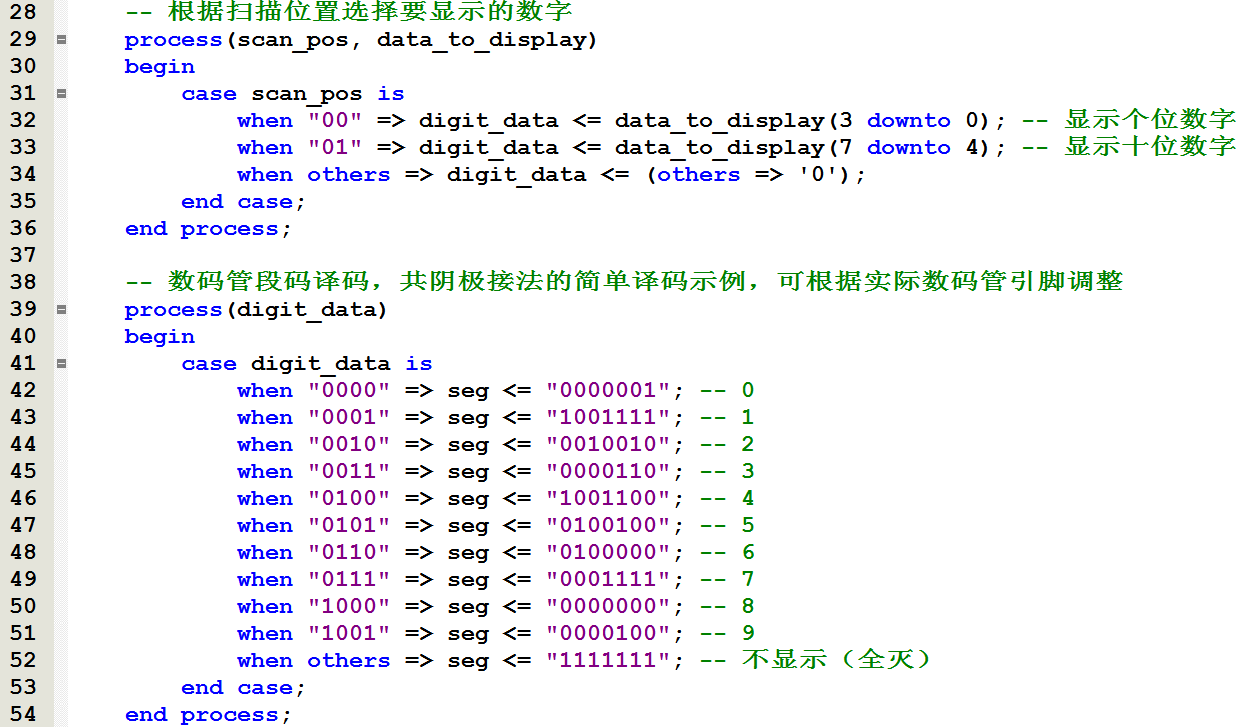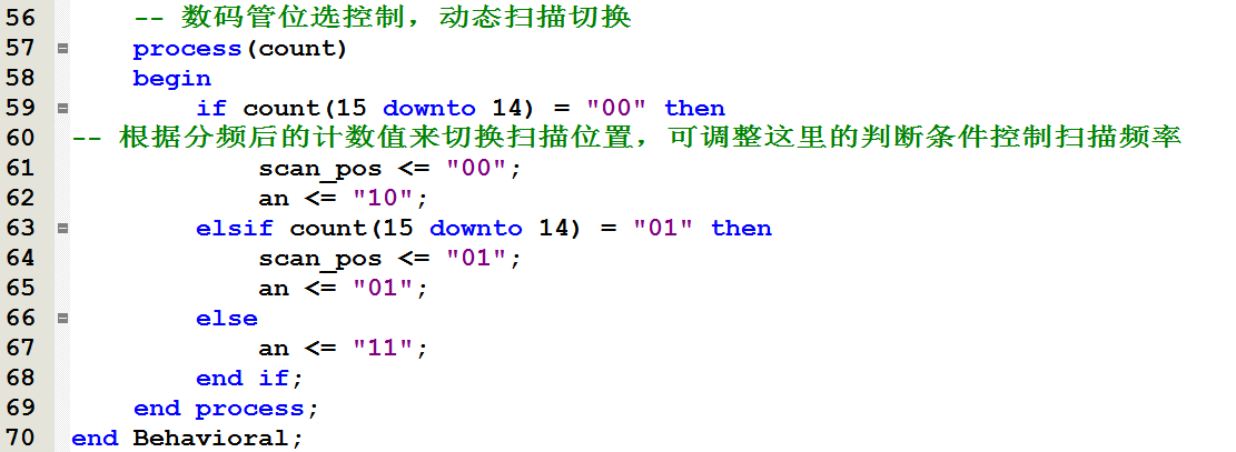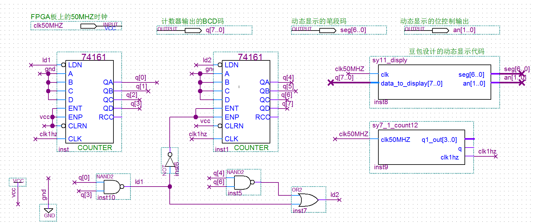 (4)仿真时,实验七任务一模块的分频比设小些,观测计数器输出的BCD码q[7..0]引脚波形是否符合M=60的加一计数器功能,下载时分频比恢复为49999999,同时观测下载后动态显示效果是否正确。