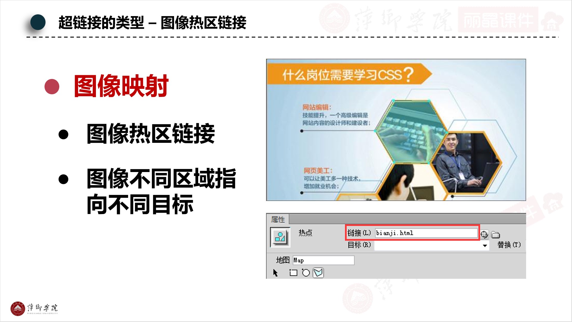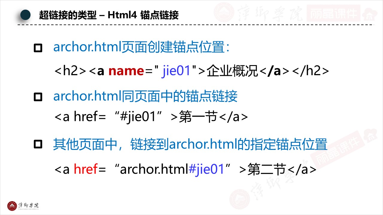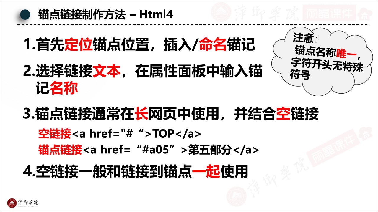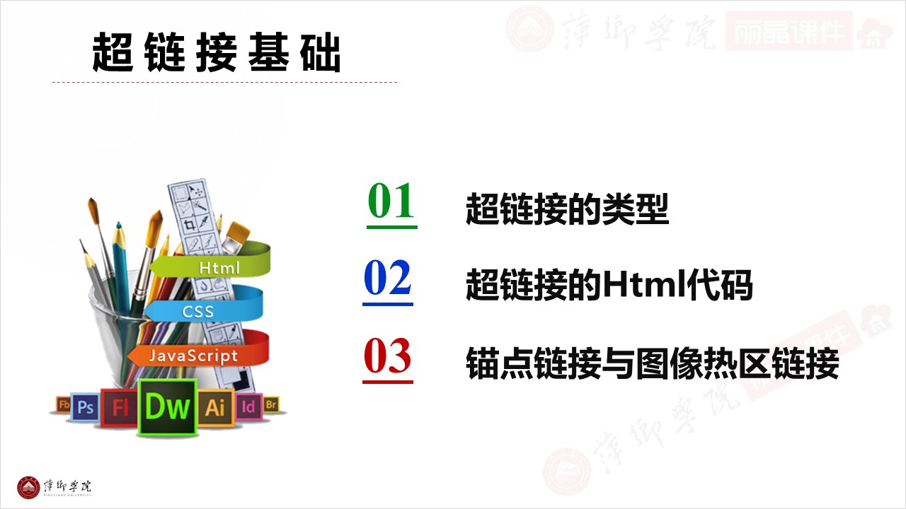 同学们好,本节课我们学习锚点链接与图像热区链接。分别演示在Html4和Html5版本的文档中的锚点链接的创建方法,并且讲解了如何在DW中创建图像热区链接。准备好了吗,我们开讲了!