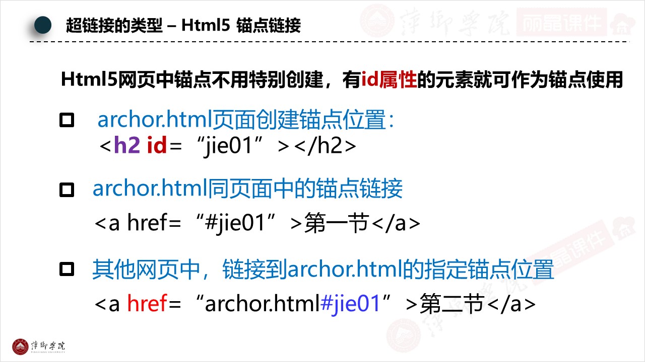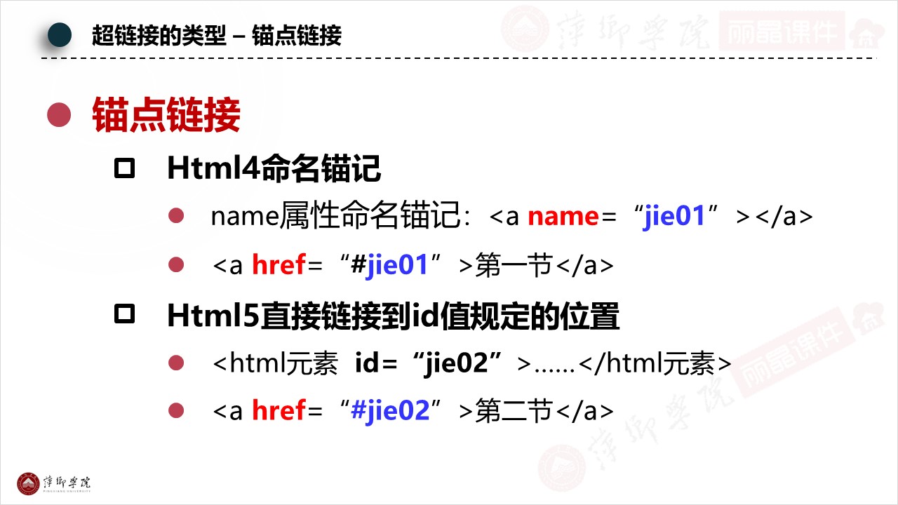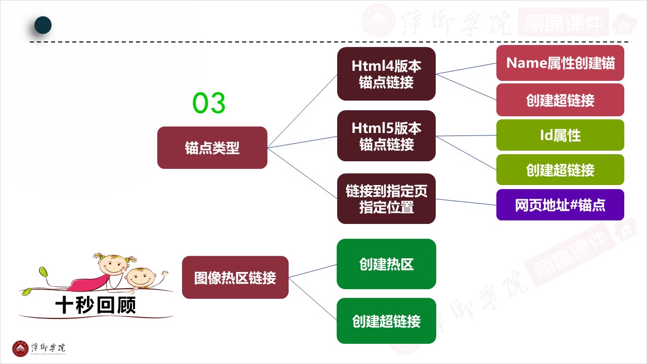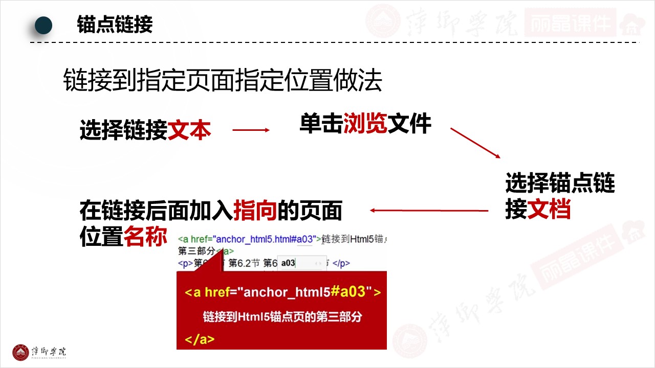 同学们好,本节课我们学习锚点链接与图像热区链接。分别演示在Html4和Html5版本的文档中的锚点链接的创建方法,并且讲解了如何在DW中创建图像热区链接。准备好了吗,我们开讲了!