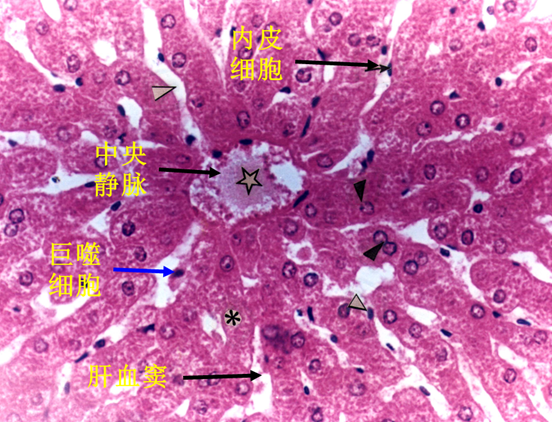 在肝血窦的内表面,附着有肝巨噬细胞,又称库普弗细胞(kupffer cell)。其形态不规则,胞质嗜酸性,以突起附着于内皮细胞上。肝巨噬细胞具有变形运动和较强的吞噬能力,可吞噬和清除血窦中的细菌、异物和衰老死亡的细胞器,并有免疫监督等功能。