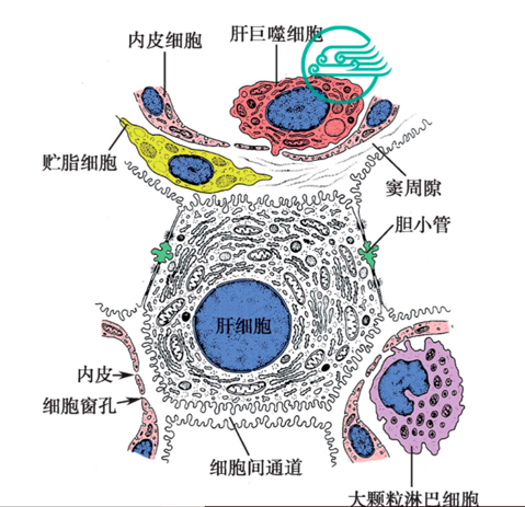 4. 窦周隙:为血窦内皮与肝细胞之间的间隙,宽约0.4μm,窦周间隙内充满血浆,肝细胞微绒毛浸泡在血浆中,是肝细胞与血浆进行物质交换的场所。窦周隙内有贮脂细胞(fat-storing cell),贮脂细胞具有贮存维生素A和合成网状纤维的功能。慢性肝炎,慢性酒精中毒,贮脂细胞增殖过快,肝内纤维增多,都将导致肝硬化。