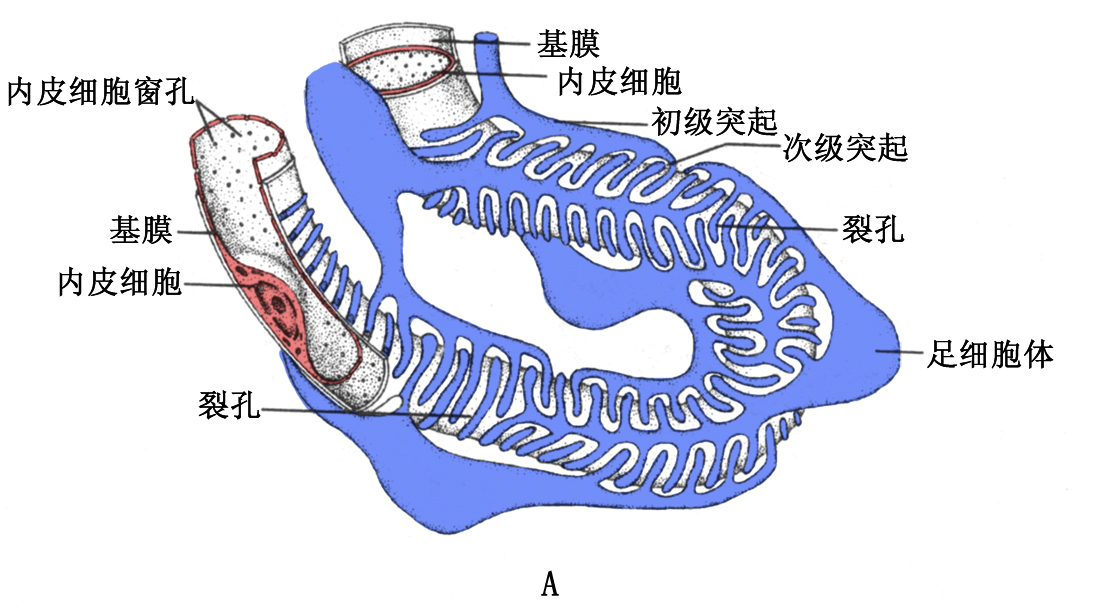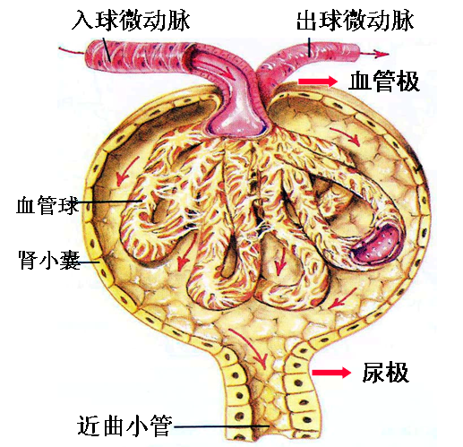 一条入球微动脉从血管极进入肾小囊内,分成4~5支,每支再分出袢状毛细血管,毛细血管又互相吻合为网,继而汇合,于近血管极处形成一条出球微动脉,离开肾小囊。人球微动脉较出球微动脉粗,使得毛细血管内血压较高。毛细血管为有孔型,孔径50~100m,多无隔膜,利于血液物质滤出。毛细血管内皮游离面的细胞衣富含带负电荷的唾液酸糖蛋白。内皮基底面除与血管系膜相接触的部位外,均有基膜。血管球毛细血管基膜较厚,其中Ⅳ型胶原蛋白形成网状结构,连接其他糖蛋白,共同形成孔径4-8nm的分子筛,在滤过中起关键作用。